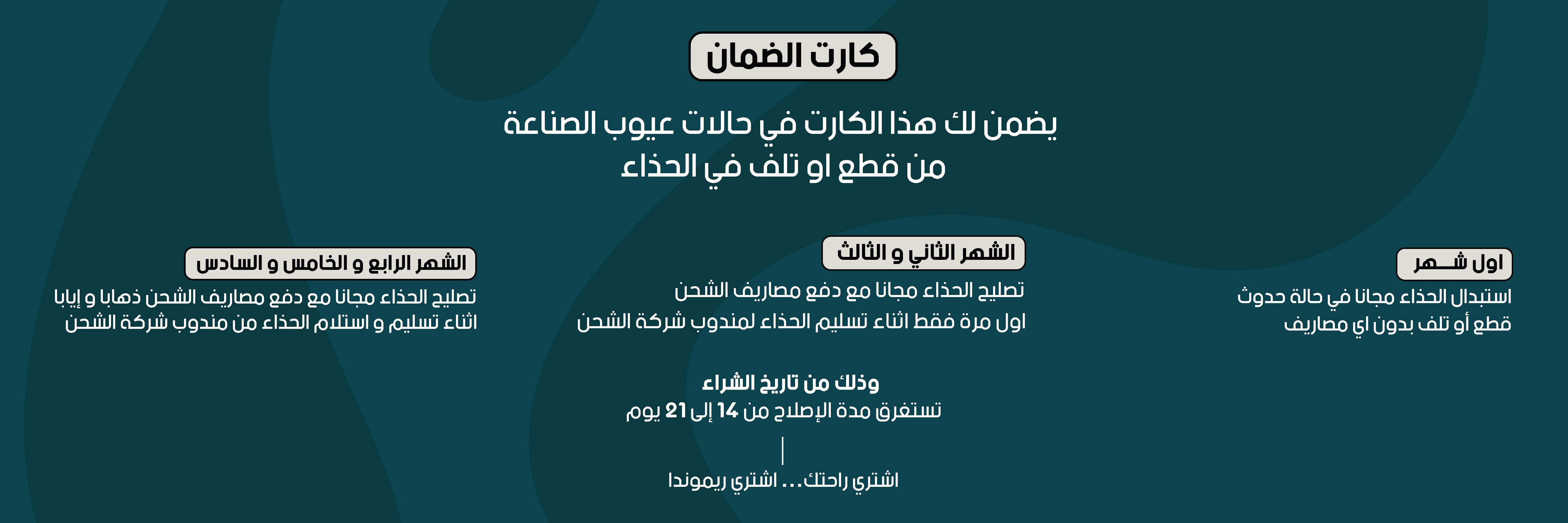 متاح ضمان لمدة 6 شهور ضد عيوب الصناعة، وده جزء أساسي من سياسة "ريموندا" والتزامنا بالجودة وراحة عملائنا